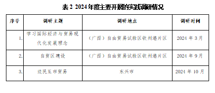 2.积极开展实践教学。学校大力开展国际商务案例库的建设、教学基础设施建设,依托南宁师范大学国际商务研究中心等平台,开展调查研究,打造MIB模拟实训室等。积极利用中国国际商务专业学位教学案例库,共享全国优质的教育资源。本年度组织学生到广西自贸区钦州港片区调研学习等地开展实践(见表2)。
