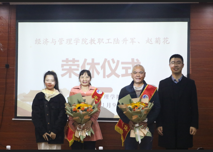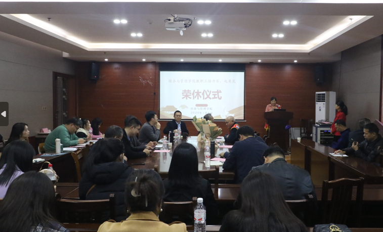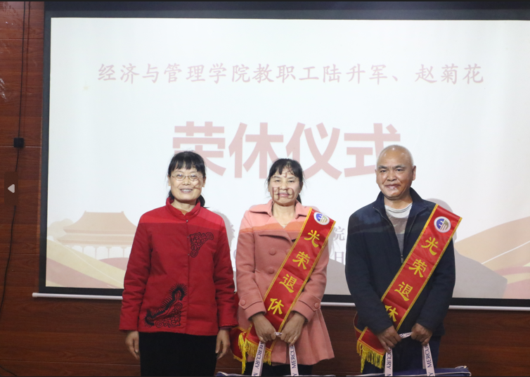 为感谢退休教师默默坚守和无私奉献,激励在岗教师立足三尺讲台的教育情怀,进一步营造幸福经管的文化氛围,1月9日下午,必威西汉姆联官网为学院陆升军、赵菊花举办了一场简单而温馨的退休仪式,学院领导班子成员及全体教职工、学生代表参加仪式,学院副院长、分工会主席何玲玲主持会议。