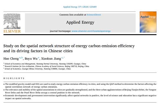 近期,我校必威西汉姆联官网程皓副教授团队在国际综合能源领域顶级期刊《Applied Energy》上发表题为“Study on the spatial network structure of energy carbon emission efficiency and its driving factors in Chinese cities”的最新研究成果。《Applied Energy》是世界能源领域著名学术期刊,在全球出版领军者爱思唯尔(Elsevier)旗下,影响因子11.2,CiteScore 21.1,高被引论文ESI全球工程期刊排名第4,列中科院一区TOP前3%。该文第一作者为我校必威西汉姆联官网程皓副教授,第二作者为我校必威西汉姆联官网2023级研究生吴柏宇,通讯作者为广西民族大学研究生蒋晓昆,南宁师范大学为该论文的第一署名单位。该研究得到了国家社会科学基金项目(21STA017)、广西哲学社会科学规划研究课题重点项目(22AJY001)和广西高等教育本科教学改革工程项目重点项目(2023JGZ143)的支持。
