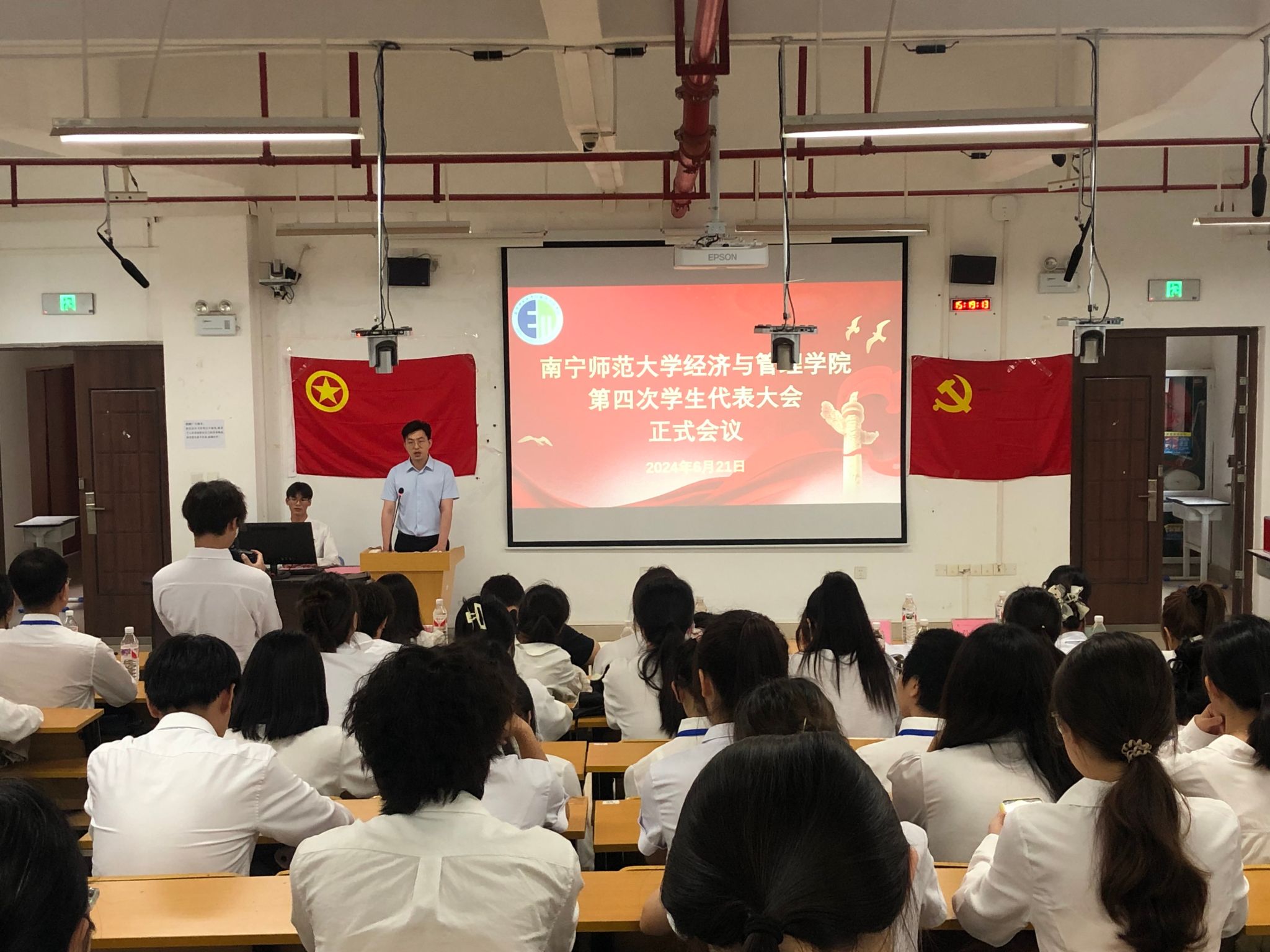 大会在庄严的国歌声中拉开帷幕。会上,由学院党委副书记何一飞致大会开幕词,回顾了过去一年学院在教育教学、学生工作等方面取得的成就,对同学们的努力和付出给予了高度评价,对同学们一年以来的辛勤付出表示感谢。他指出,广大学生干部要坚定理想信念、充分发挥职能、强化自身建设,不断激发内生动力和活力,更好地代表广大同学、服务广大同学。学院执行主席陆柳政介绍了本次大会的主题和议程,学生会主席团成员代表罗荣荣对大会作出报告,全面回顾和汇报了第三届学生会的工作及成绩,科学谋划了未来一学年学生会奋斗目标和工作任务,大会听取和审议通过《南宁师范大学必威西汉姆联官网学生会工作报告》。大会进行了新一届学生会委员会的选举,通过全体代表的民主投票,最终产生了黄耀衫等29名同学为我院第四届学生会成员。新任学生会成员黄耀衫宣读大会倡议书,他表示,在未来的新一学年里,将以更加饱满热情和务实的态度积极开展各项工作,为广大学生提供更加优质的服务,为学院发展贡献力量。最后,学院学工办辅导员刘家瑶老师致闭幕词,向在座的同学们表示感谢并提出殷切期望,鼓励同学们坚守初心,始终如一,学会掌握团队管理的方法与技巧,号召同学们在岗位上成长锻炼,贡献青春力量。