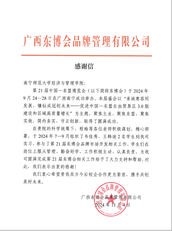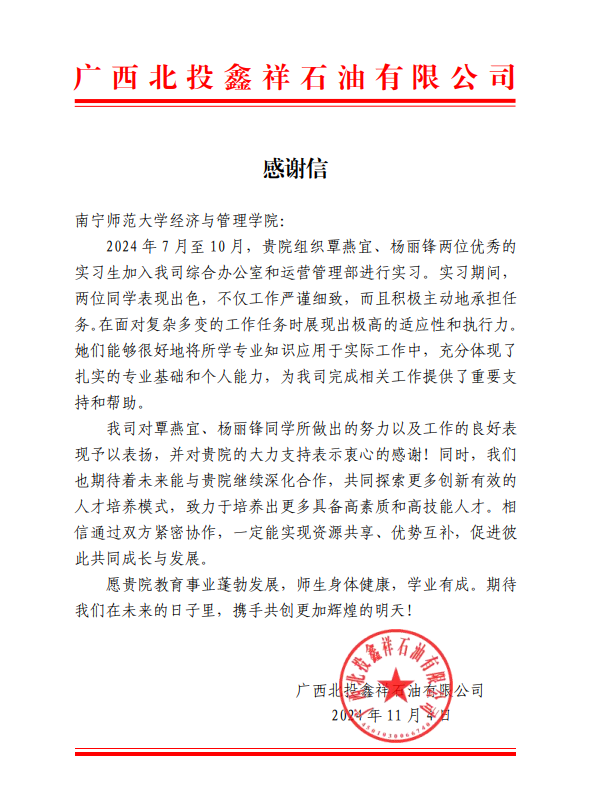 2024年11月,必威西汉姆联官网收到来自广西东博会品牌管理有限公司和广西北投鑫祥石油有限公司的两封感谢信,信中对学院今年7-10月派送的实习生在实习期间的表现予以高度赞扬,对学院的实习指导表示高度认可,对学院长期以来注重学生专业知识、综合素质培养等方面给予了充分肯定。感谢信具体内容如下: