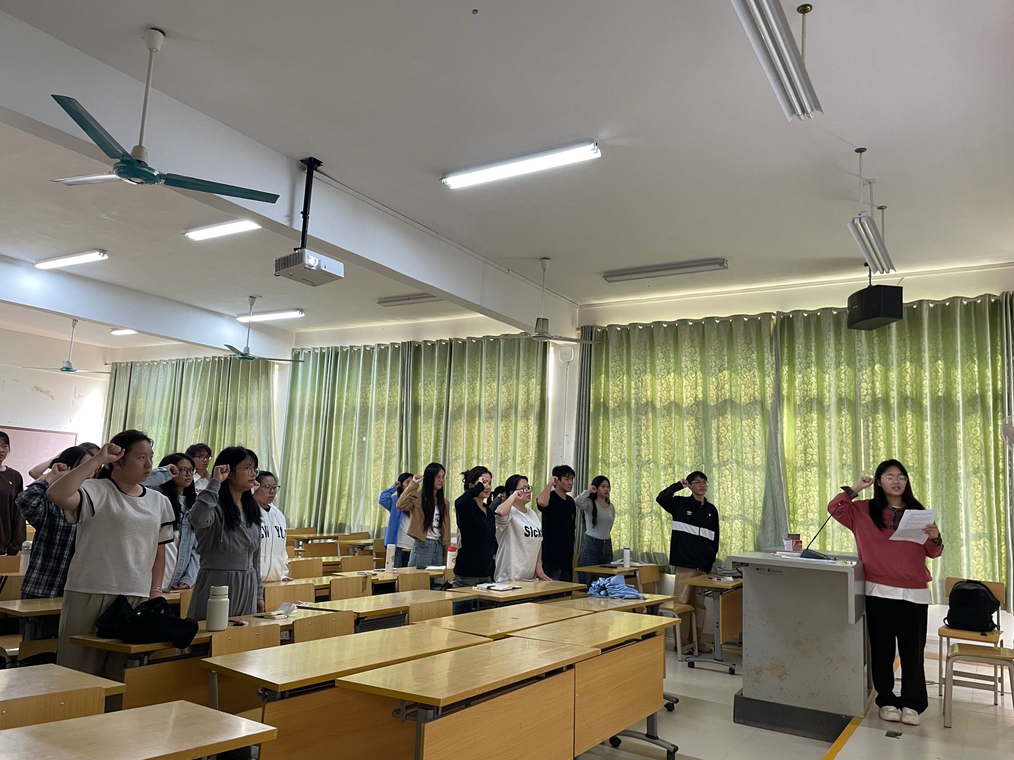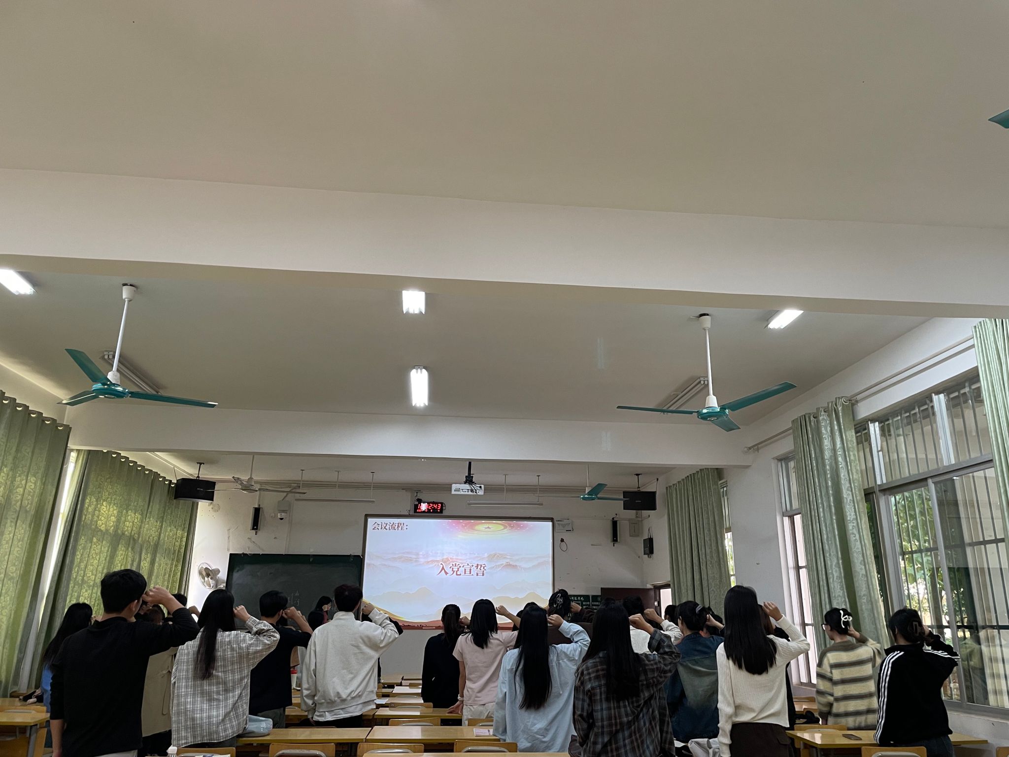 会议开始,支部副书记周琴介绍会议的流程及具体要求。全体同志起立奏唱国歌,然后按照预备党员转正大会流程,唐鑫兰等两位预备党员依次宣读转正申请书,并汇报自己在预备期间的表现、对党的认识及有关情况。入党介绍人及支部委员介绍预备党员有关情况,并对其能否按期转为正式党员表明意见,预备党员本人作表态发言。经正式党员进行无记名投票表决,唐鑫兰等两位同志通过投票决议,已符合转为正式党员的标准,同意其按期转正。随后,支部书记陈思娴发表建议,希望本次转为正式党员的同志在今后的学习和生活中秉持乐观向上的心态,坚持以党员的标准严格要求自己,加强政治理论学习。最后,由支部副书记周琴作为领誓人,带领全体党员同志起立宣誓。