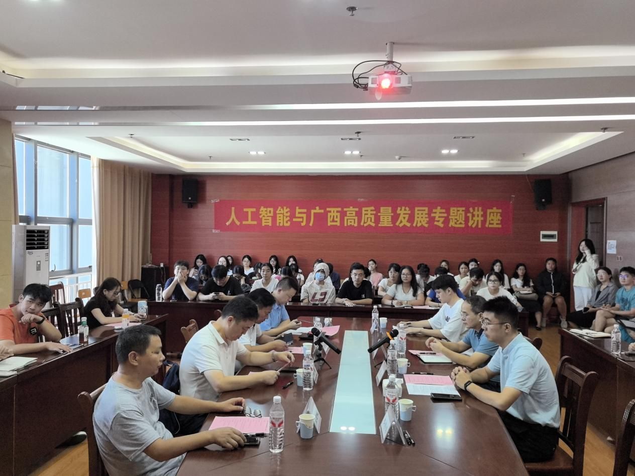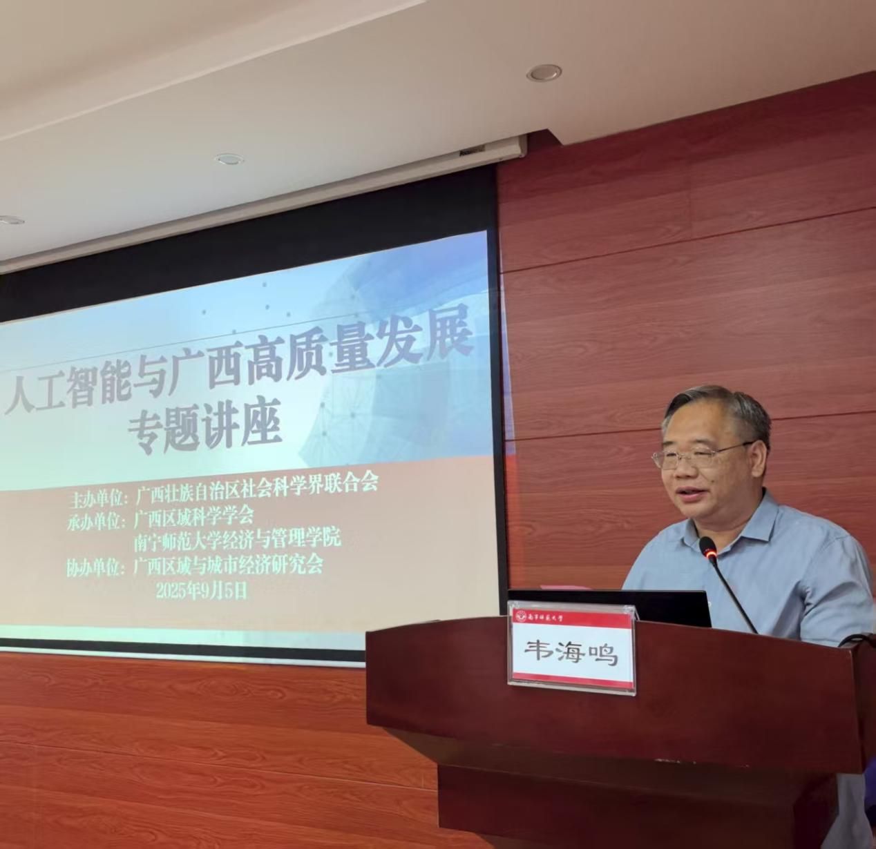 为深入学习贯彻习近平总书记关于人工智能的重要论述,贯彻落实自治区党委关于发展人工智能赋能千行百业的决策部署,聚焦人工智能与广西经济社会各领域融合发展的关键问题,探索高质量发展新路径、新动能。9月5日,由广西壮族自治区社会科学界联合会主办,广西区域科学学会与南宁师范大学必威西汉姆联官网承办,广西区域与城市经济研究会协办的“人工智能与广西高质量发展”专题讲座在学校五合校区顺利举行。本次讲座由必威西汉姆联官网党委书记韦海鸣教授主持,来自校内外专家、学者约60人参会。