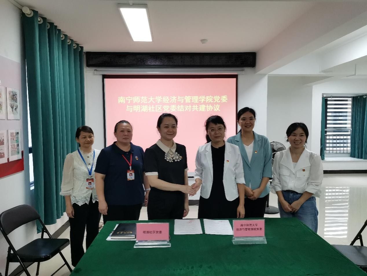 为进一步深化党建引领,推动高校与社区资源共享、优势互补,2025年9月23日下午,南宁师范大学必威西汉姆联官网党委与明湖社区党委在明湖社区党群服务中心举行结对共建签约仪式。学院党委副书记、院长何玲玲教授,公共管理系主任陈柳源博士,公共管理系教师韦立立副教授,明湖社区党委书记、居委会主任杨绍贤、明湖社区党委副书记胡晓丹、明湖社区副主任陆春香等双方领导及相关学生教师代表参加了本次签约仪式。