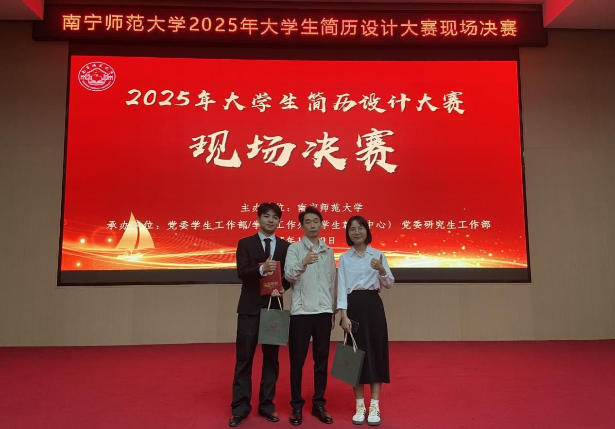 11 月 9 日,南宁师范大学 2025 年简历设计大赛决赛落幕,我院学子斩获佳绩:2023 级人力资源管理专业本科生龚崇伟(简历指导老师:闭闲)获金奖,直通第三届大学生职业规划大赛校赛决赛;2024 级行政管理专业研究生黄盟意(简历指导老师:兰勇)获优秀奖。