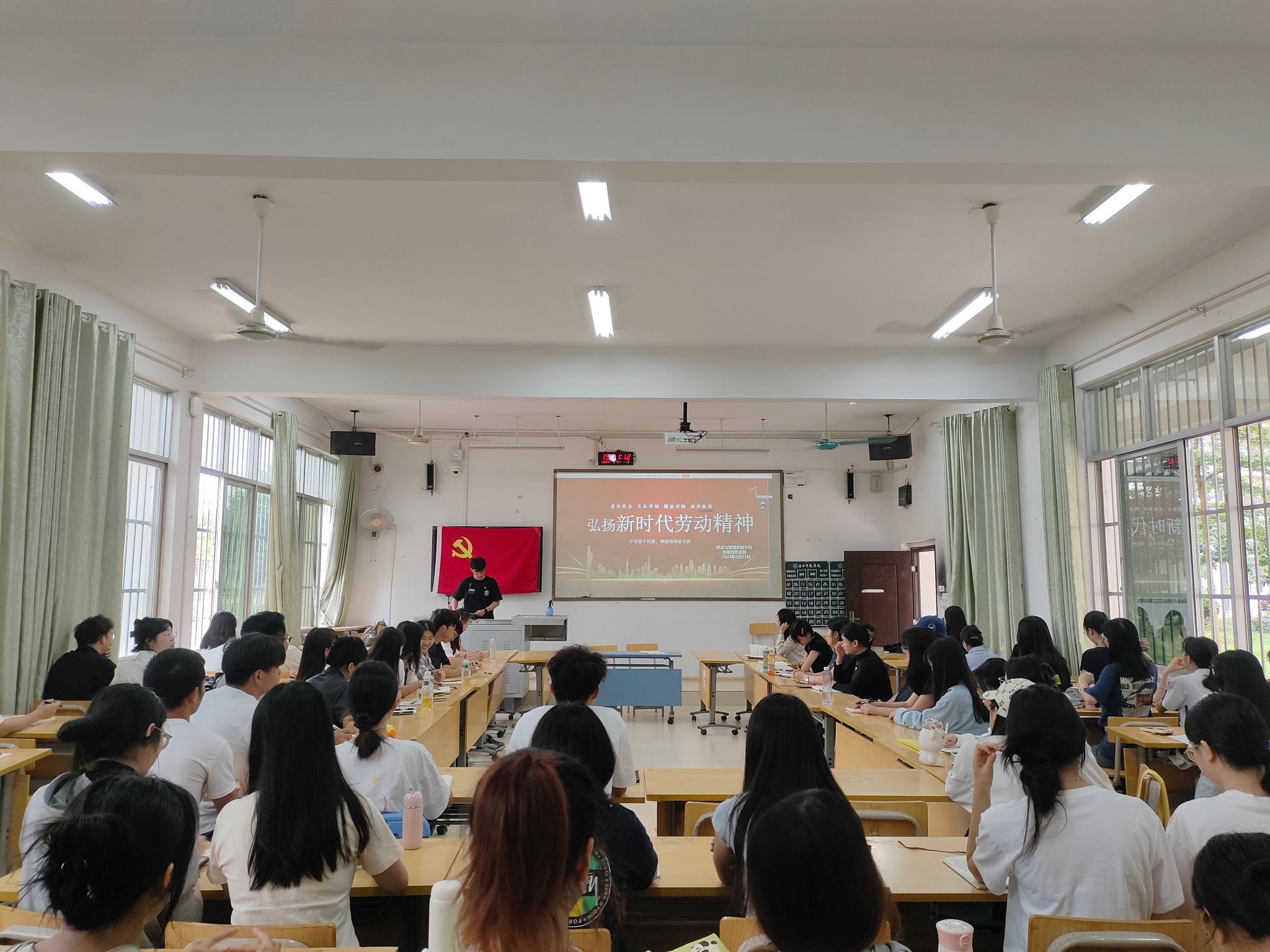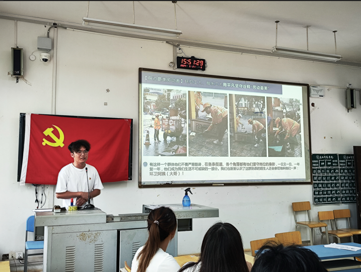 接下来是“发现身边最美劳动者”的分享环节,李明慧等4名同志以图片展示的形式向党员们讲述图片背后的劳动者故事。李明慧同志分享了强降雨中环卫工人、交警和消防员在恶劣天气下迅速行动,保障市民安全与交通的身影。赖华健同志分享排水工人在恶劣天气中坚守岗位,疏通排水,保障城市免受水患的身影。陆志洪同志分享宿管阿姨从事平凡工作,却又悄无声息地关怀着每位同学的身影。黄羽同志分享食堂的阿姨默默提供了干净整洁的用餐环境的身影与贵阳荔波的环卫,默默捞除湖中树叶,保护着湖泊的美丽的身影。