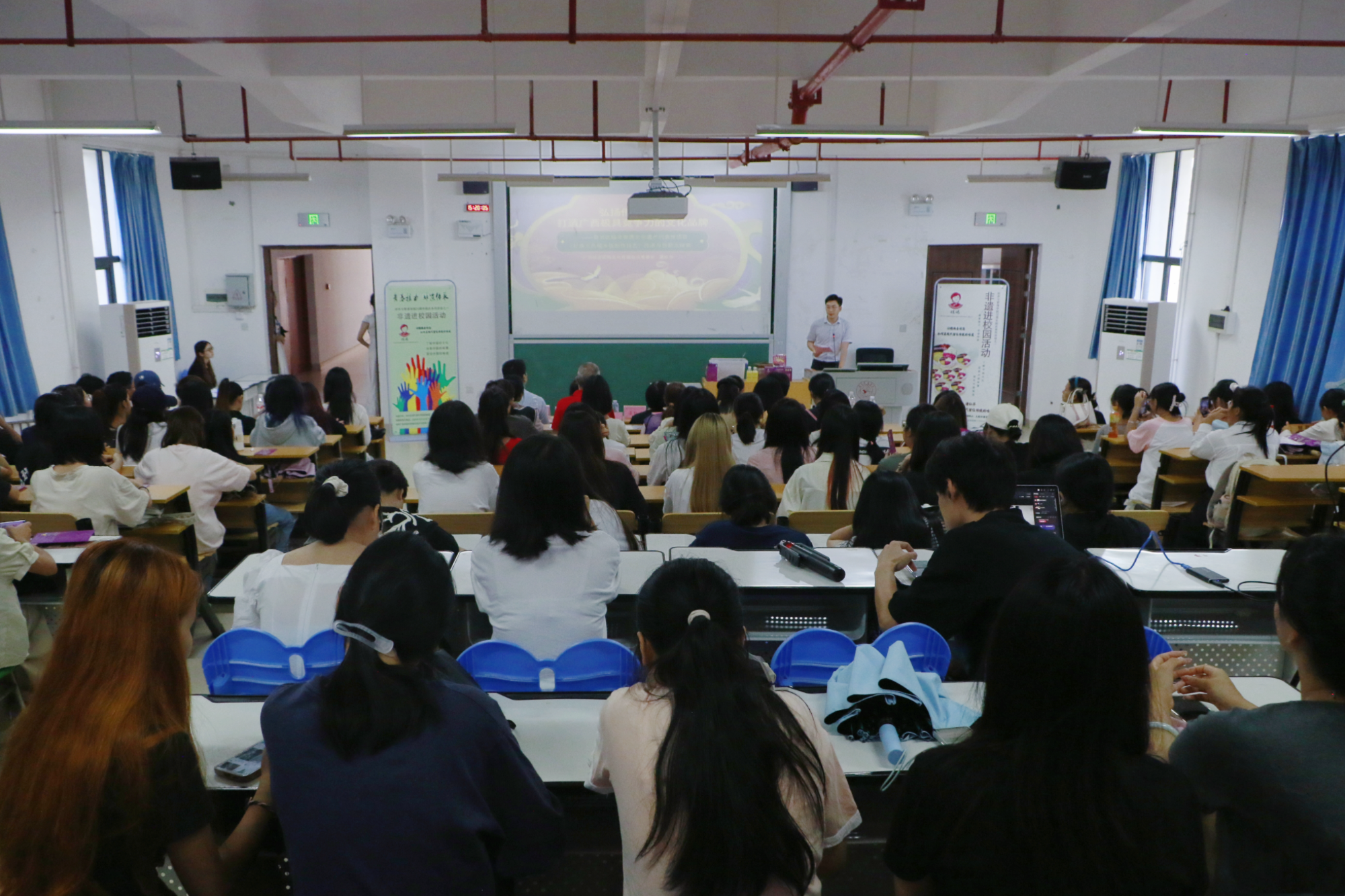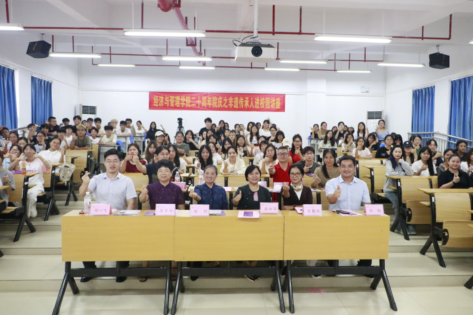 为庆祝必威西汉姆联官网成立二十周年,传承和弘扬非物质文化遗产,广泛传递非遗的内涵和价值,10月22日下午,必威西汉姆联官网于文理综合楼文楼开展非遗传承人进校园讲座。广西壮乡民俗文化有限公司董事长潘红华作主讲人,学院副院长何玲玲、党委副书记何一飞、文化产业管理系主任张聪、文化产业管理系专任教师曾艳红、肖琳文、康青林、漆亚莉、陈列(退休)参加,文化产业管理专业全体学生参加。