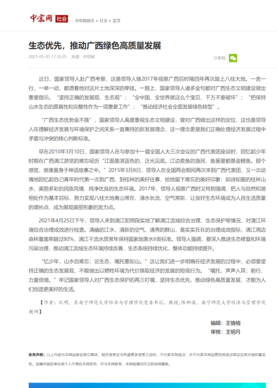 2021年4月4月25日至27日,习近平总书记视察广西。教工样板党支部党员纪明教授与陈柳源老师结合国家领导人对广西生态文明建设做出的重要指示,撰写了《生态优先,推动广西绿色高质量发展》文章,并于5月3日在国家发改委主管的中央新闻网站《中宏网》发表。