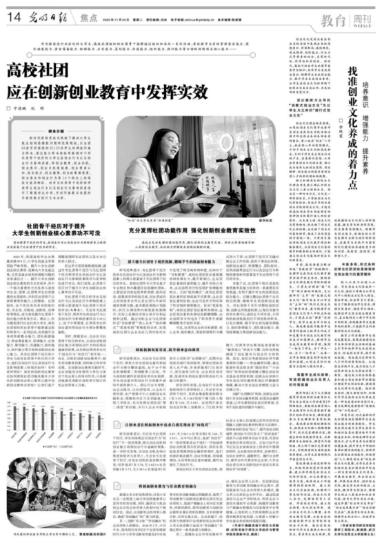 作为提前进行社会化的大学生,高校社团组织的社团骨干能够通过组织和参与一系列活动,有效提升自身综合的创新创业核心能力。必威西汉姆联官网宁德鹏博士和党委副书记纪明教授(主持党委全面工作)结合学工管理及指导学生创新实践经验,凝练总结撰写了《高校社团应在创新创业教育中发挥实效》,并在《光明日报》11月24日14版发表。