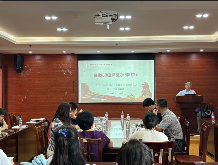 韦海鸣院长以“强化纪律意识 坚守纪律底线”为题,讲述了党员干部违纪的典型案例。他指出,党员教师要以案为鉴知敬畏,不断增强党性观念,在工作与生活中切实遵守党规党纪,进一步树立纪律意识,筑牢拒腐防变的思想防线,切实担当为党育人、为国育才的光荣使命。